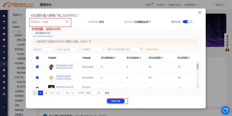 第二步:點(diǎn)擊方案詳情,采納方案,可選擇修改預(yù)算,最低6000元/60天