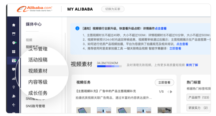 第二步:店鋪上傳“主圖視頻”,操作流程為:MyAlibaba-媒體中心-視頻素材-上傳視頻-確認(rèn)上傳-關(guān)聯(lián)主圖/詳情商品-等待審核,具體流程可以查看https://www.yuque.com/mosheng-ed4re/nef92b/yh7ev0#1ud0c;