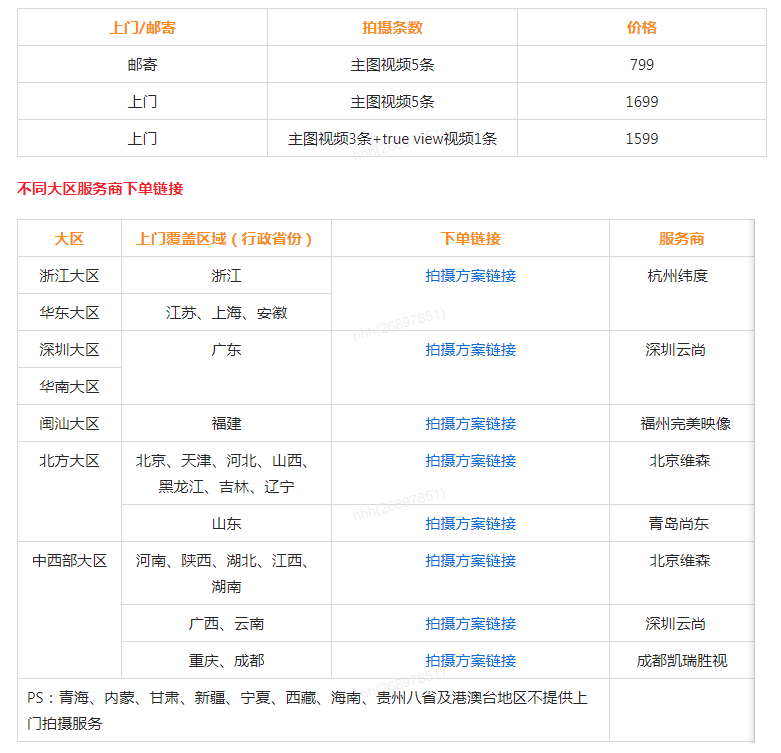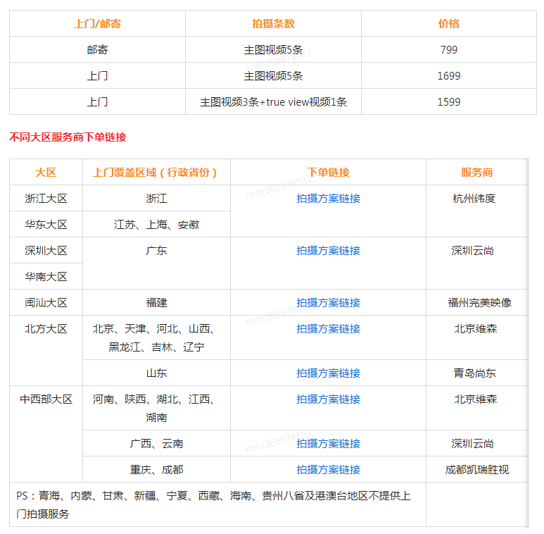 如果店鋪無(wú)優(yōu)質(zhì)視頻:建議購(gòu)買三方拍攝,外貿(mào)服務(wù)市場(chǎng)針對(duì)本次活動(dòng)給出專屬拍攝優(yōu)惠,協(xié)助發(fā)布優(yōu)質(zhì)視頻,服務(wù)商拍攝優(yōu)先審核,具體方案如下,各大區(qū)商家可以根據(jù)指定服務(wù)商進(jìn)行下單