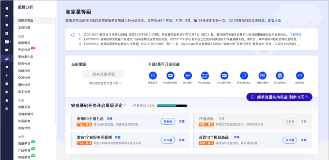 為了幫助新商家更快熟悉平臺規(guī)則、了解平臺運營方法、快速成長為星級商家,商家星等級將近一步細(xì)分商家成長階段,鼓勵新商家通過完成“新手推薦任務(wù)”做好建站的基本準(zhǔn)備,新店鋪加速啟動,為店鋪經(jīng)營和升星建立更好的運營基礎(chǔ)。商家星等級評定開啟節(jié)點變更于2022年5月6日正式上線生效。