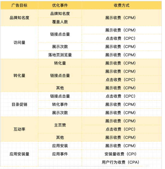 但是這些收費(fèi)方式不是可以隨意進(jìn)行選擇的,不同的廣告目標(biāo)對(duì)應(yīng)的有不同的收費(fèi)方式,具體可參見(jiàn)下圖: